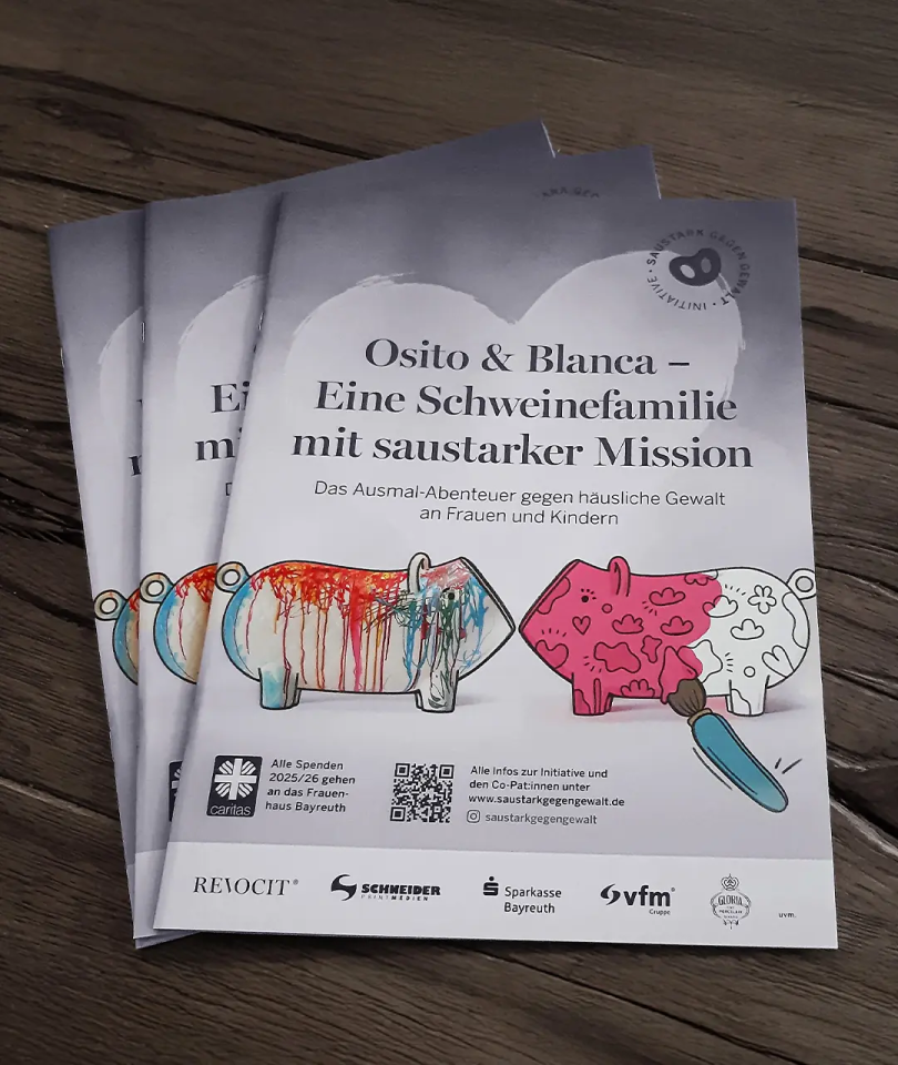 Unser Malbuch verbindet Kreativität mit einer wichtigen Botschaft: Häusliche Gewalt an Frauen und Kindern ist niemals akzeptabel. Mit „Osito und Blanca – Eine Schweinefamilie mit saustarker Mission“ setzen wir ein sichtbares Zeichen und unterstützen gleichzeitig die Arbeit des Frauenhauses Bayreuth. Verkaufserlös = 100 % Spende Der Kaufpreis von 10 € geht vollständig an das Frauenhaus Bayreuth. Jedes Exemplar hilft direkt Frauen und Kindern, die Schutz und Unterstützung benötigen.